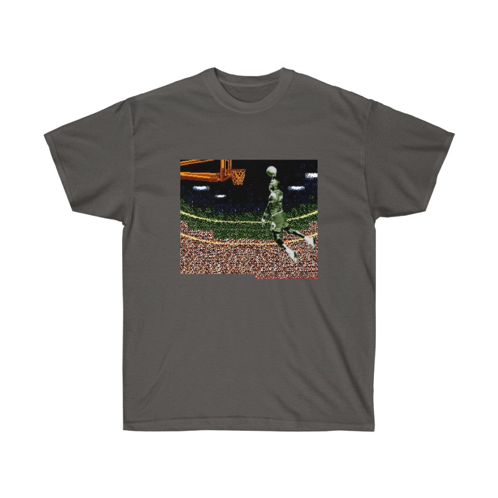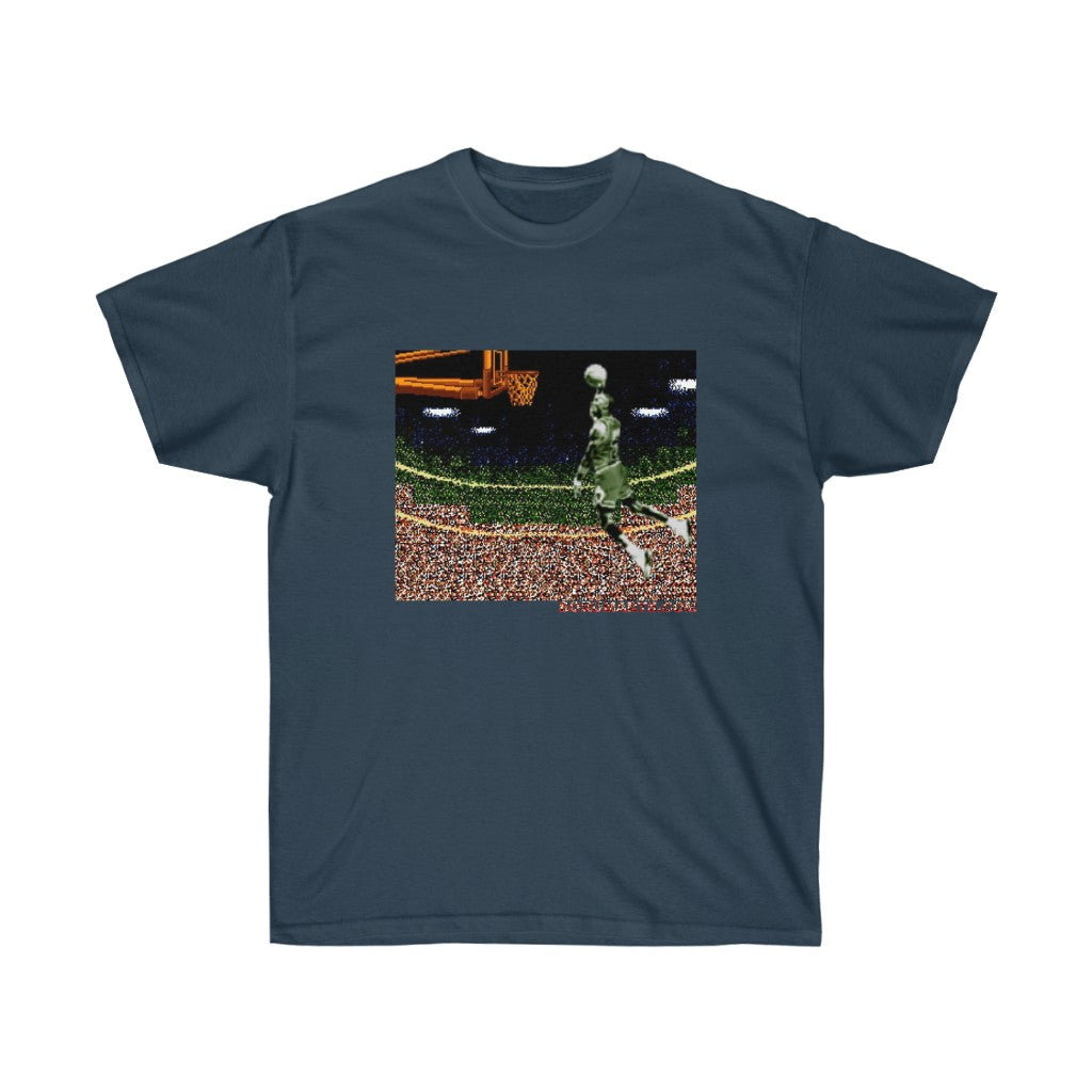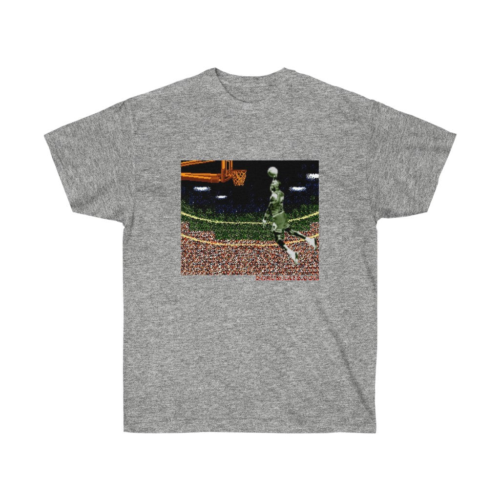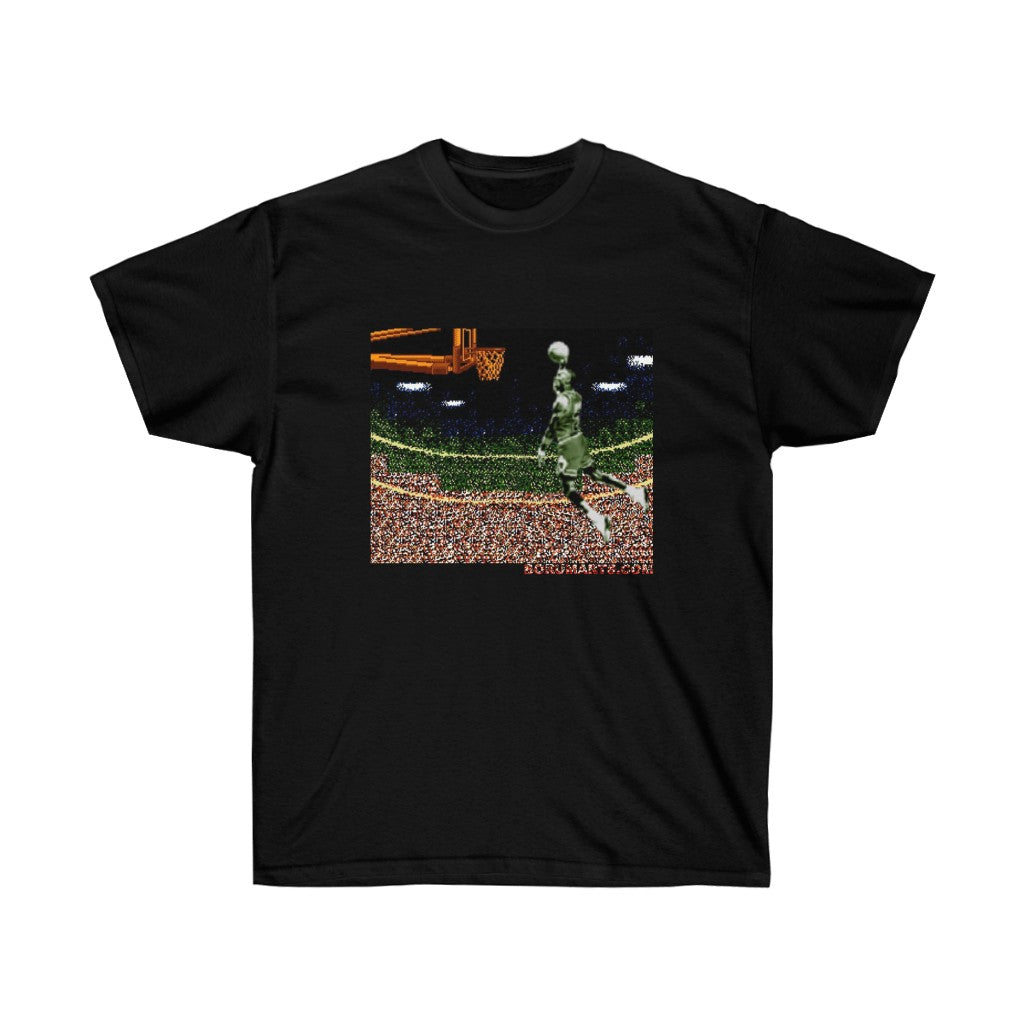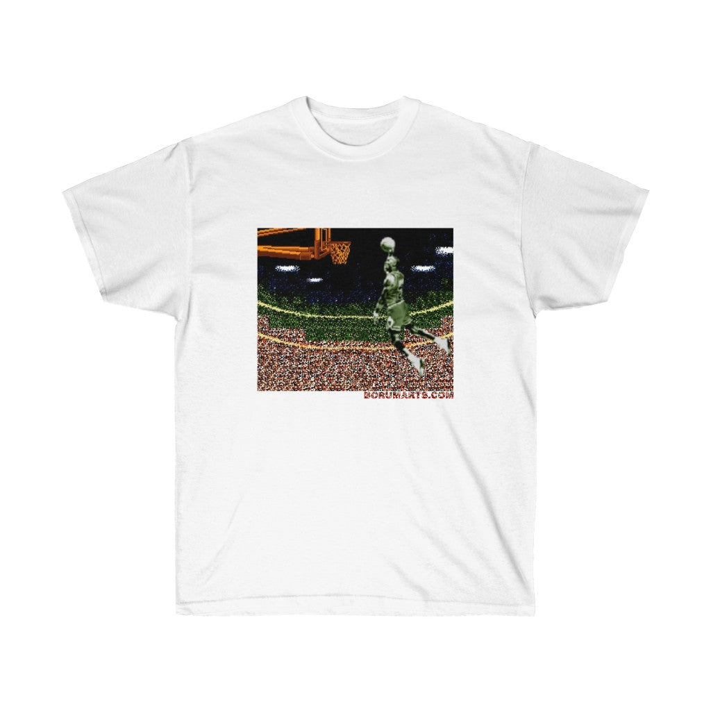 Why an iconic video game franchise would name their game after a basketball infraction is baffling. Anywho...celebrate this iconic dunk from this individual in pixelated prize fashion. All my 8bit baller heroes. Its time to Double Double Dribble Dribble. This unisex ultra cotton tee is a classic. Quality cotton construction means that designs are sure to shine. The shoulders are tapped for a good upper-body fit. There are no side seams, ensuring a clean, unbroken flow. The collar has ribbed knitting for improved elasticity. The materials that went into this product are sustainably sourced and economically friendly.