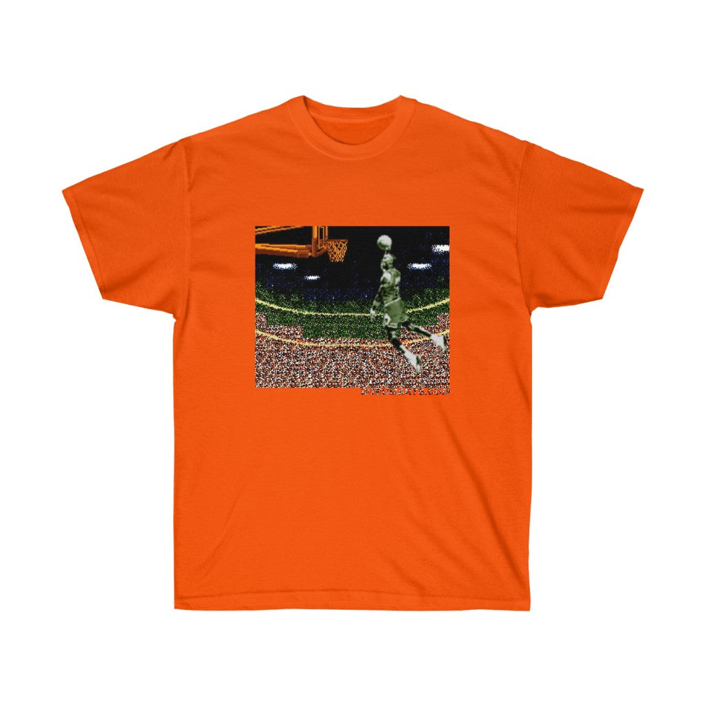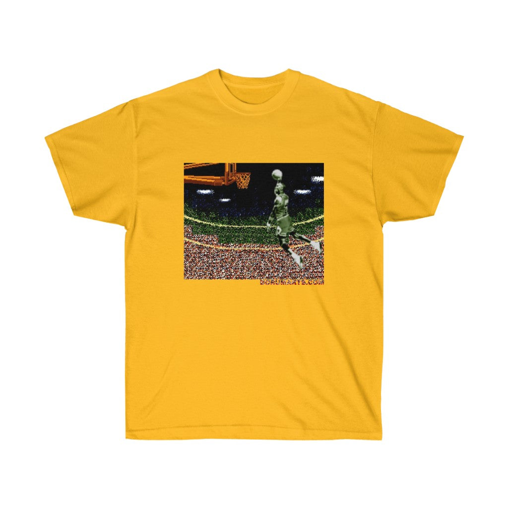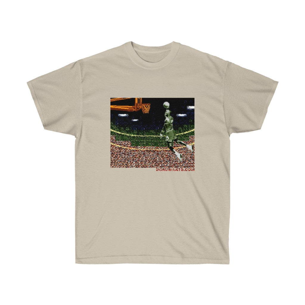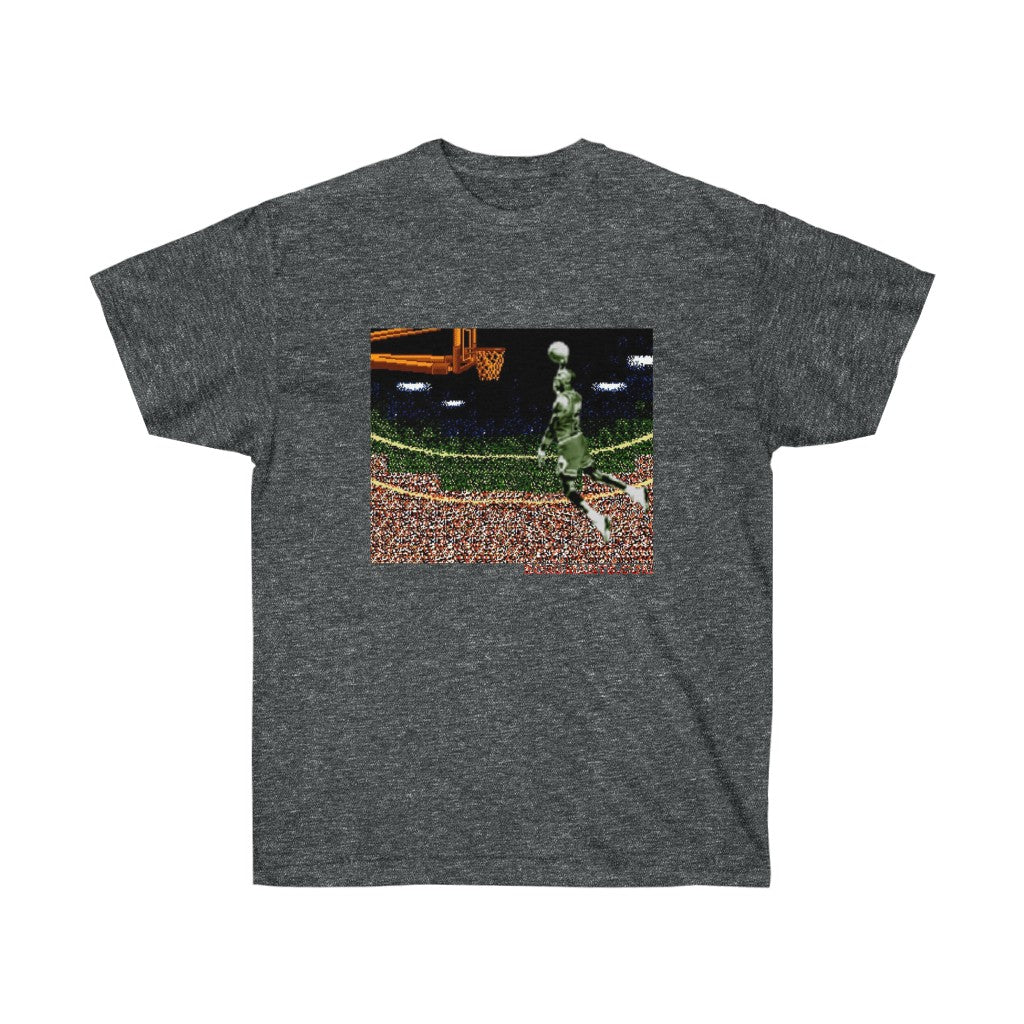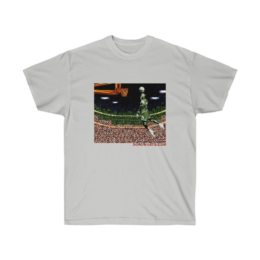 Why an iconic video game franchise would name their game after a basketball infraction is baffling. Anywho...celebrate this iconic dunk from this individual in pixelated prize fashion. All my 8bit baller heroes. Its time to Double Double Dribble Dribble. This unisex ultra cotton tee is a classic. Quality cotton construction means that designs are sure to shine. The shoulders are tapped for a good upper-body fit. There are no side seams, ensuring a clean, unbroken flow. The collar has ribbed knitting for improved elasticity. The materials that went into this product are sustainably sourced and economically friendly.