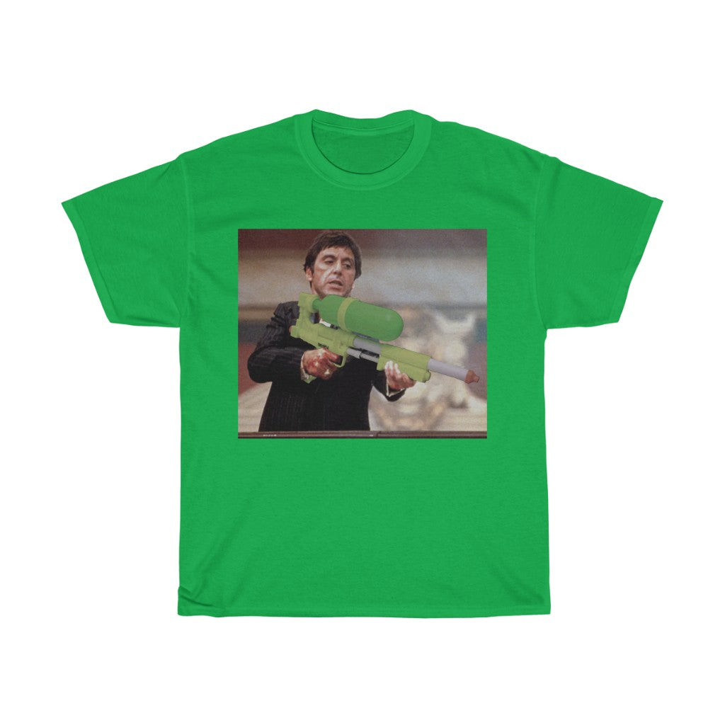 Combining two completely unrelated things from my childhood into a whole new scene. My super soaker and Mr.Tony Montana from the movie Scarface. This heavy cotton tee has a classic cotton look and feel. Casual elegance will make it an instant favorite in every man's wardrobe.
