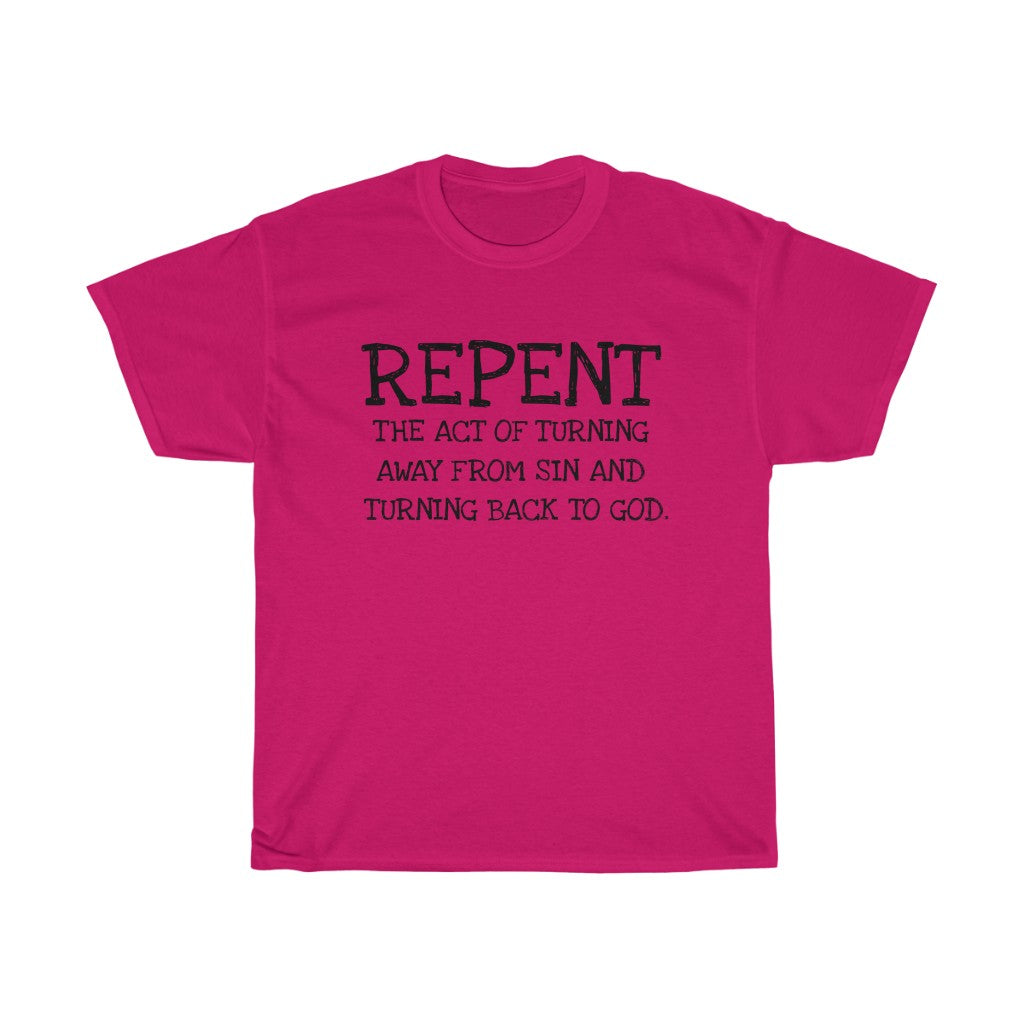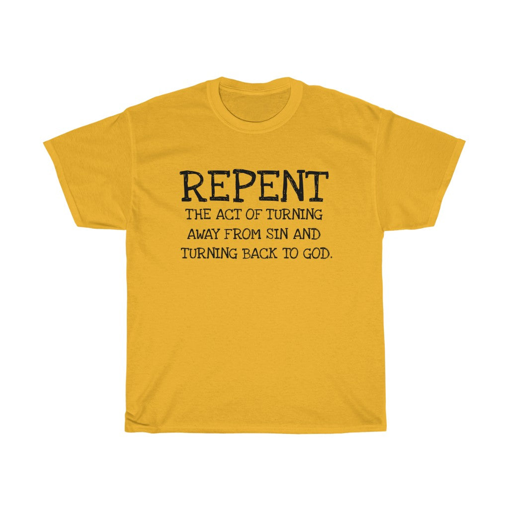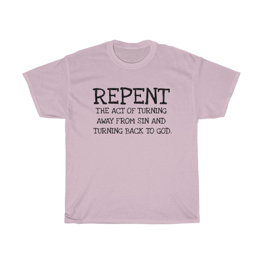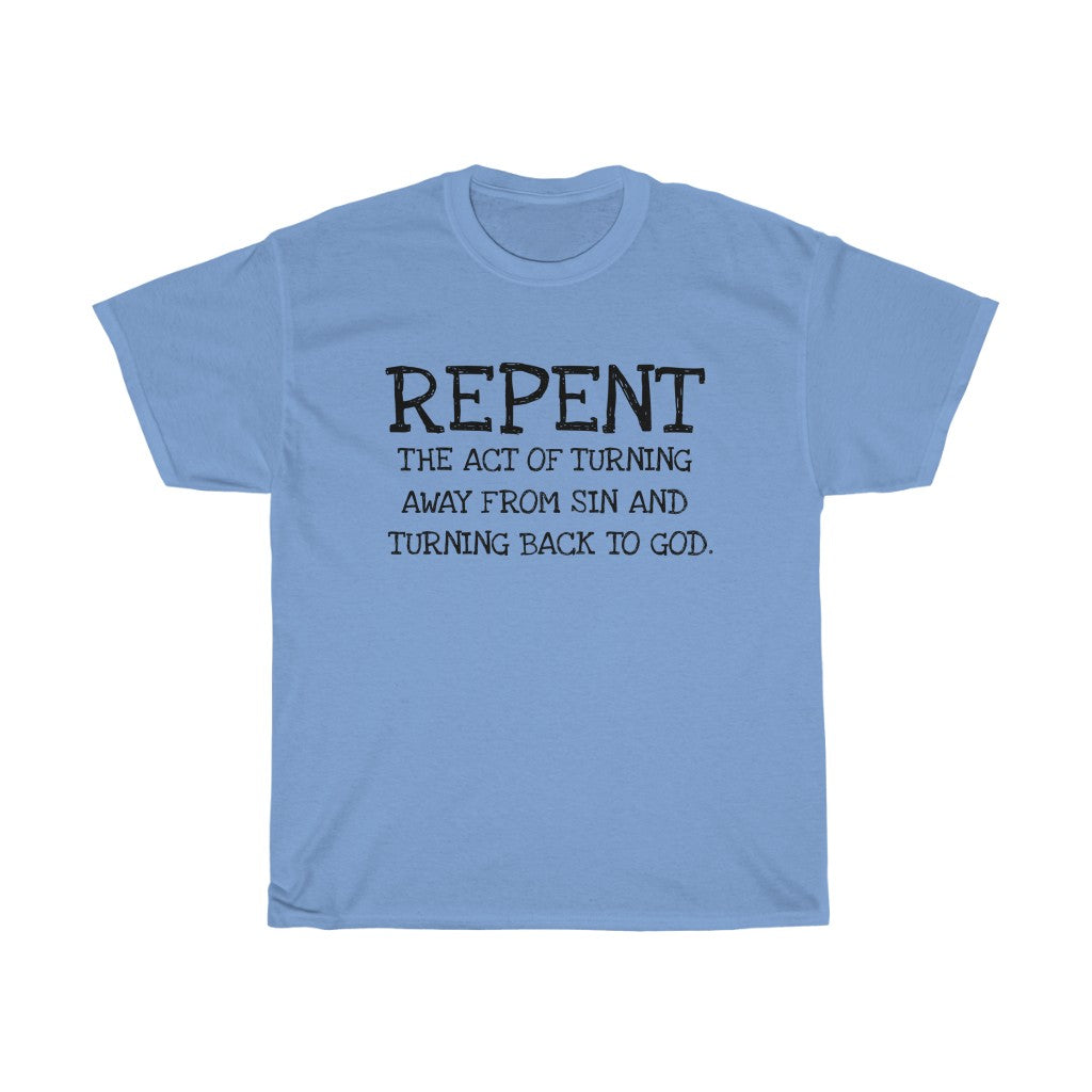 Repentance is the ultimate act of humility. It begins with an acknowledgment of sin and admission of one's need for a savior. It also alleviates an individual from the idea of being responsible for their own salvation. There is one who died so that we might be reconciled unto God. Come to Christ with a repentant heart and he will never turn you away. The greatest feeling in the world is to know that I have done wrong, and yet I am forgiven and accepted. Halla. This heavy cotton tee has the classic cotton look and feel. Casual elegance will make it an instant favorite in everyone's wardrobe.